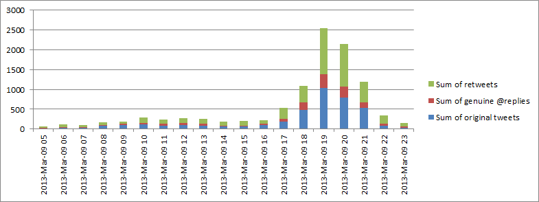 This post continues my analysis of Twitter data concerning the WA state election, held on 9 March 2013: see this post for an introduction to this project. Previous posts have looked at election-related hashtags, candidates’ posting patterns, and the networks formed between candidates through @mentions, replies, and retweets.