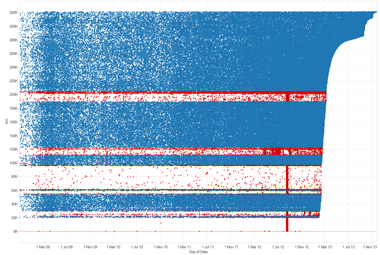 Not only do The Contagious have a suspicious first 20,000 followers, but further batches of 5000 between approximately 23,000 and 28,000 and 54,000 and 59,000, as well as about 30,000 between 60,000 and 90,000. Even after this, 10,000 between around 110,000 and 120,000 appear suspicious, and there is also a final burst of suspicious looking followers to get the band over the 200,000 follower mark, from around 190,000 to 200,000. All told, around 80,000 of the bands over 320,000, or 25%, appear to have been acquired illegitimately. We can’t say definitively that they were purchased, but they certainly do not appear natural.